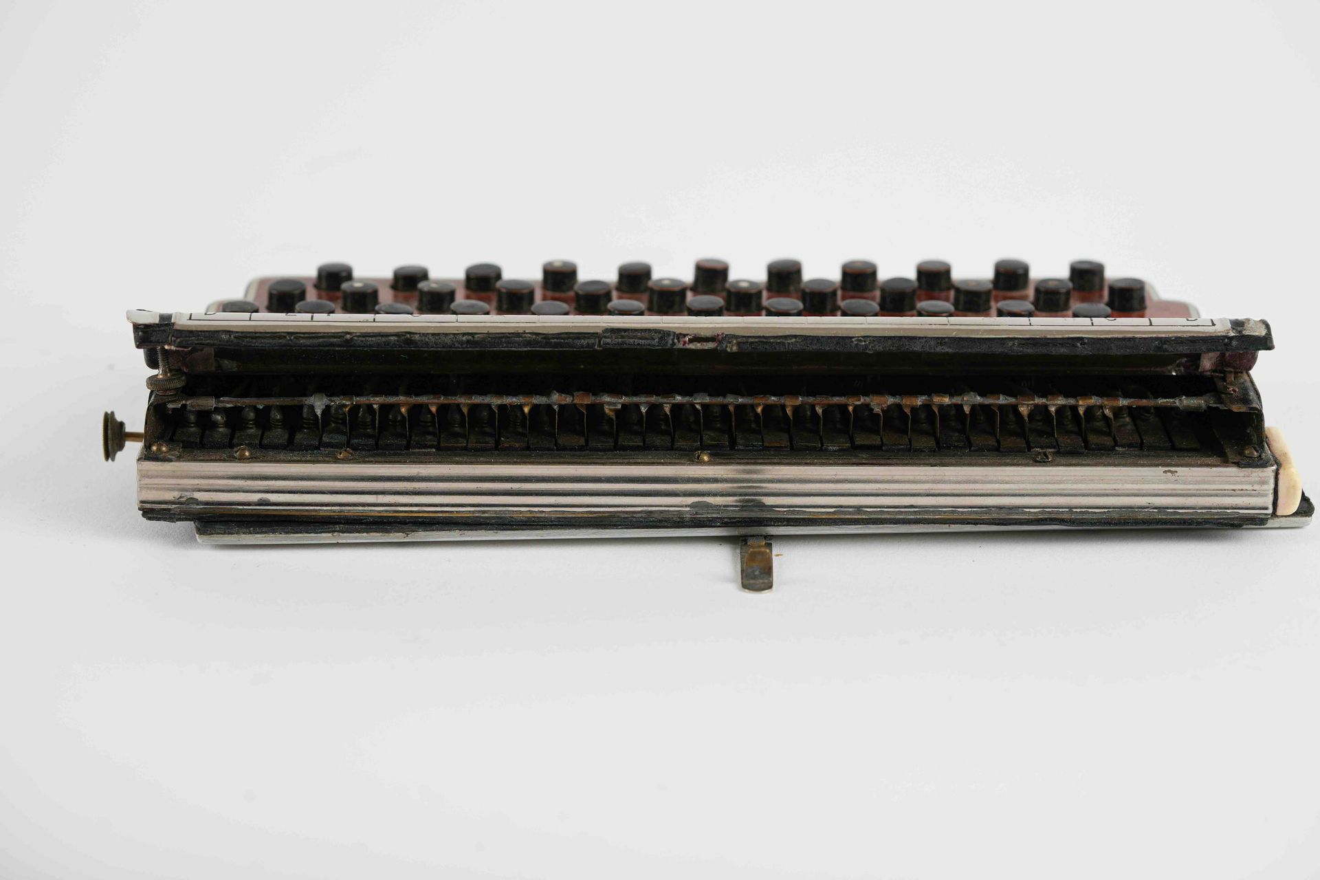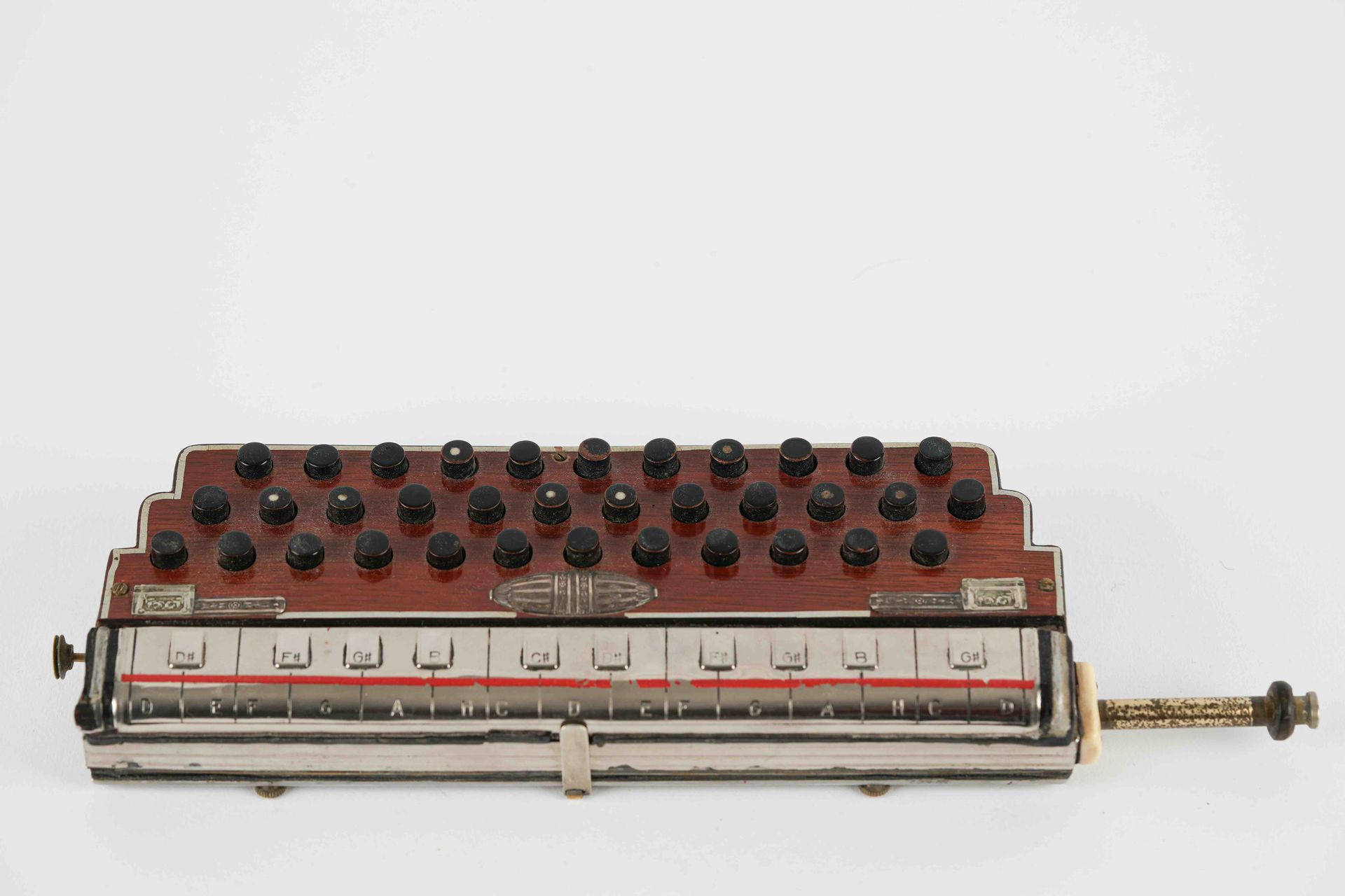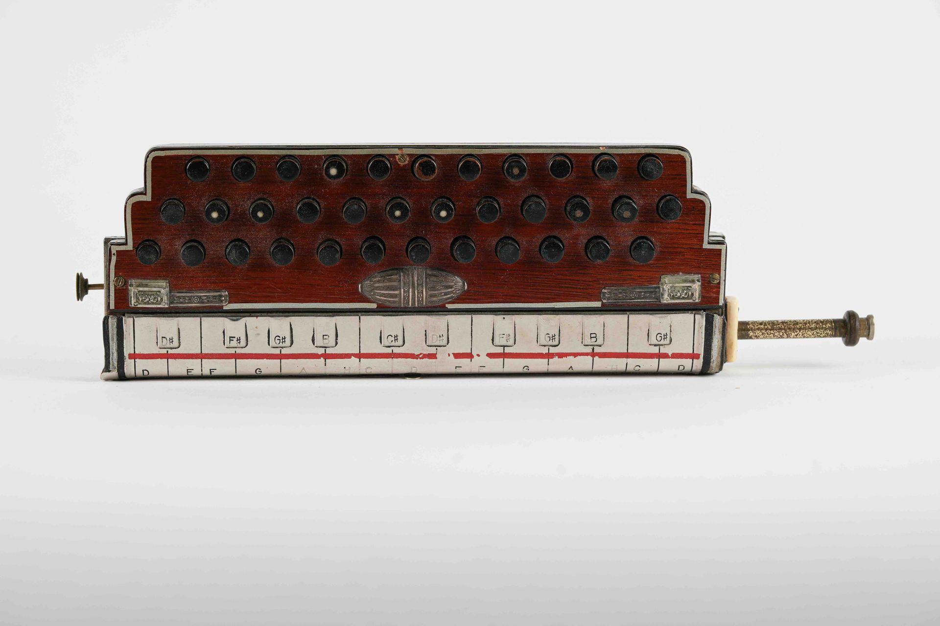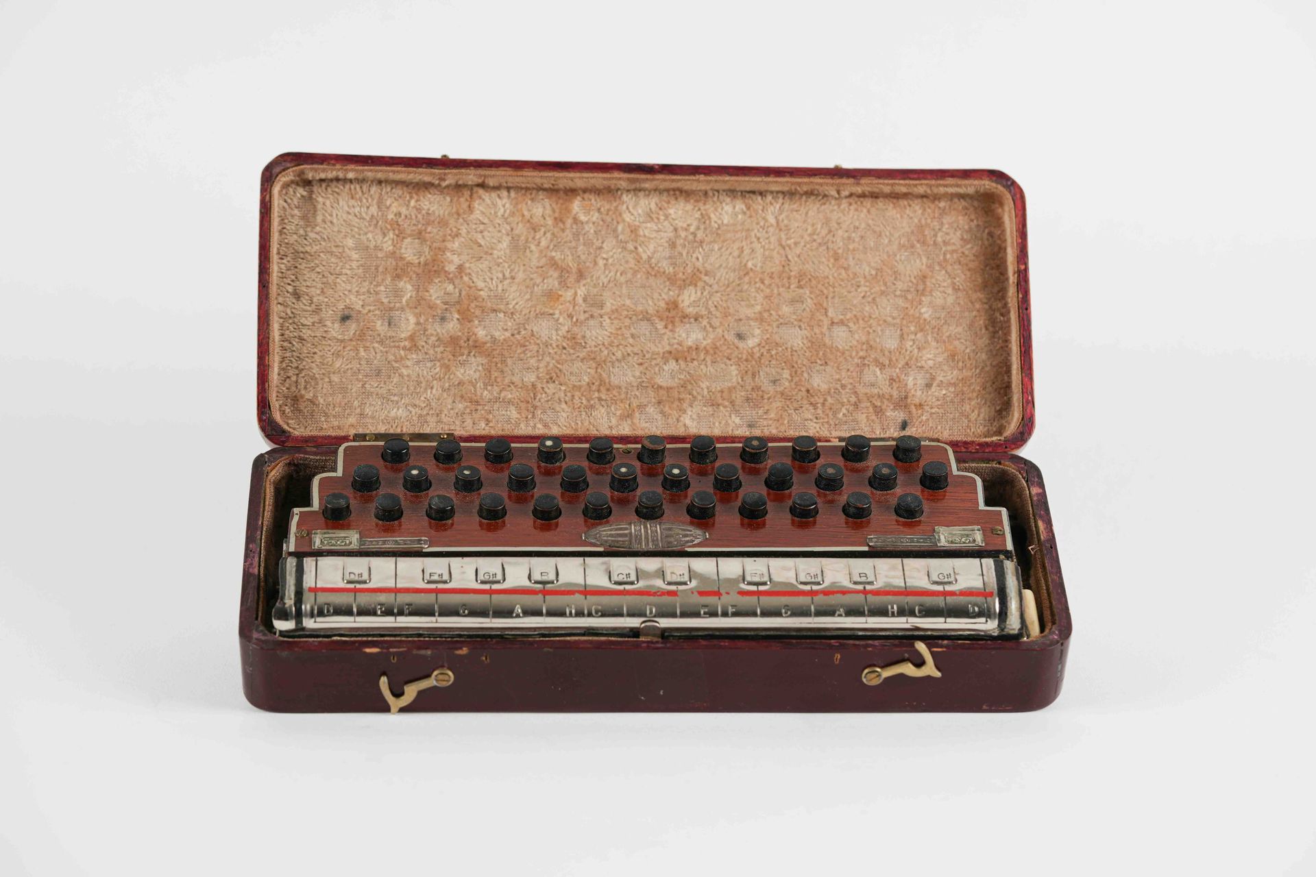 44 Denne akkordinaen har tre knapperader som på et knappespill med c-griff, Den spiller bare på blås, men har en ekstra knapp på enden som forskyver hele toneplaten en halv tone opp som på et kromatisk munnspill. To oktaver, fra d til d’’. Jeg fant den i Tony Binghams butikk for sjeldne musikkinsdtrumenter i London i 2005. Toner og toneplate av messing. Sannsynligvis ra 1930-årene.