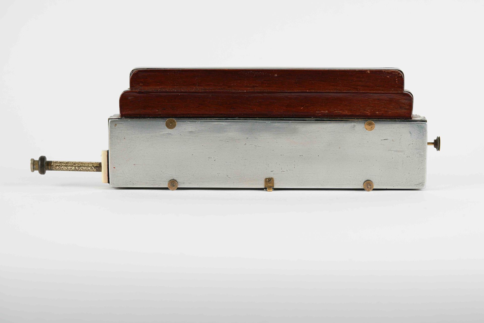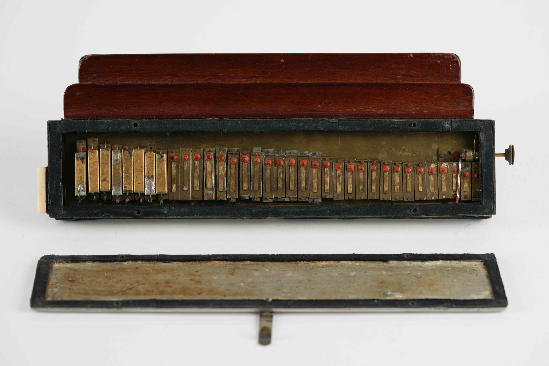 44 This accordina has three button rows like a c-griff accordion. It only plays on blow, but has an extra button at the end that slides the whole reedplate up a half tone, like a chromatic mouth harmonica. Two octaves, from d to d’’. I found it in Tony Bingham’s rare musical instrument shop in London in 2005. Brass reeds, brass reedplate. Probably from the 1930s.