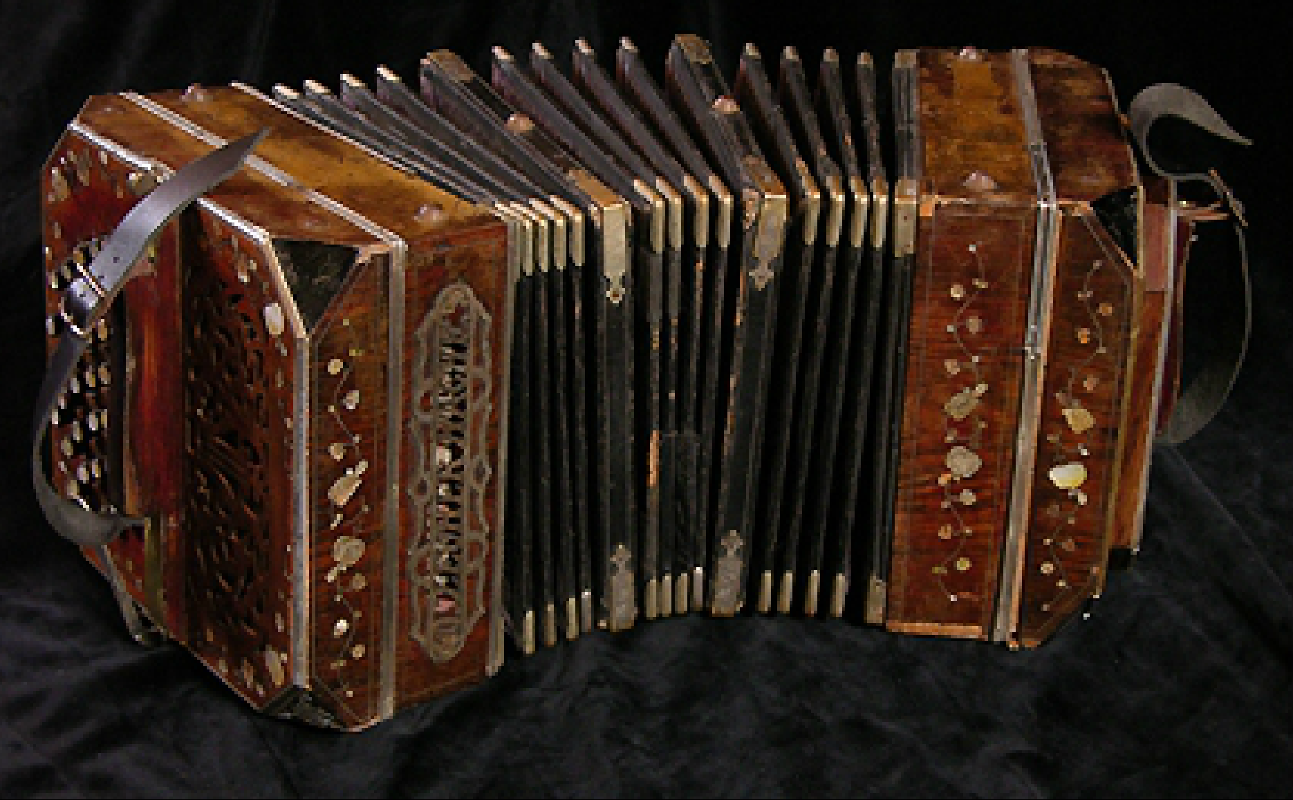 13 Bandonion. O. Zeuner Nachfolger, Leipzig, 1921. To kor, 4’+ 8’, 106 toner. Opprinnelig 104 toner, en kontra a/store d bygget på (i 1932?). Rhinsk (argentinsk) system. Ståltoner klinket på felles zinkplater. Knapper av ibenholt og perlemor. Dekorasjon av perlemor og nysølv. Grunntone G (stemt ned fra A i 1932). 21 x 21 x 38 cm