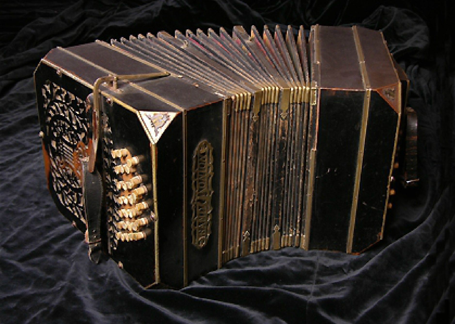 16 Bandonion, ukjent merke, ca. 1920. Tre kor, 4’ + 8’ + 8’, 110 toner. Argentinsk system. Ståltunger klinket på felles aluminiumsplater. Knapper i ben og perlemor. Dette instrumentet har en spesielt stor belg med lærfolder som trenger mindre bevegelser. 26 x 32 x 45 cm