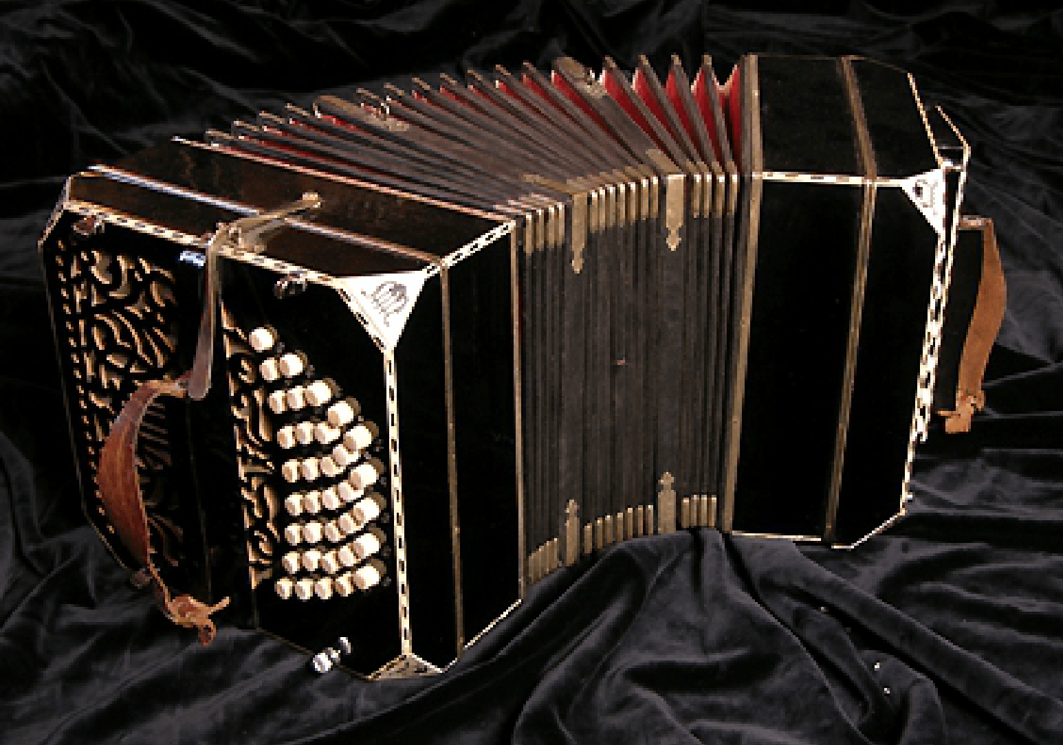 25 Bandonion ELA, ca 1940. Dual voice, 8’ + 8’. 120 toner, Einheitsbandoneon. Steel reeds riveted to common aluminum reedplates. Synthetic buttons, celluloid veneer. 24 x 26 x 32 cm