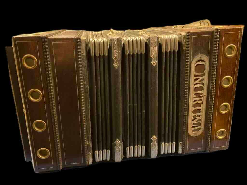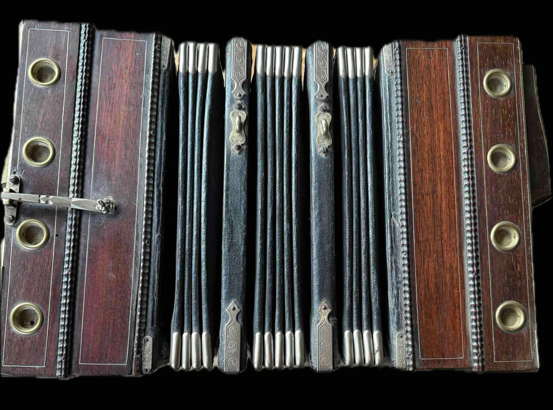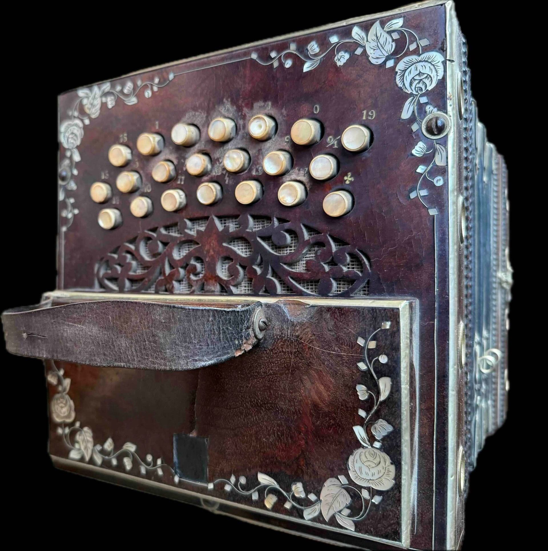 Denne velbrukte konsertinaen ble kjøpt av musiker Arne Moslåtten (Hellbillies) på en auksjon et sted I Telemark på 1980-tallet. Den kunne ha kommet til Norge med en tysk soldat under krigen, som ikke var uvanlig. Tyske konsertinaer fantes knapt I Norge før krigen.