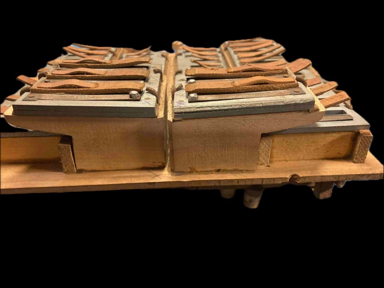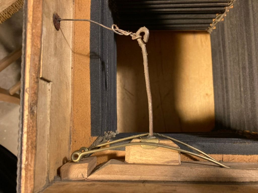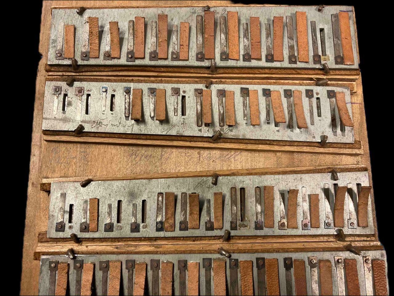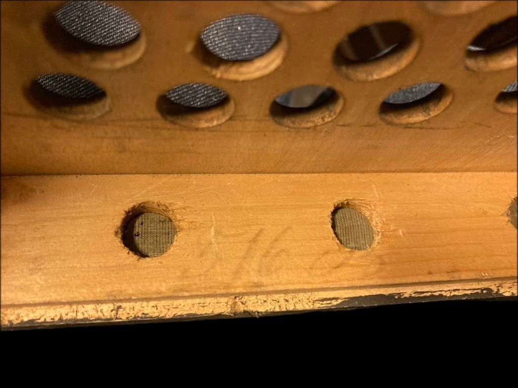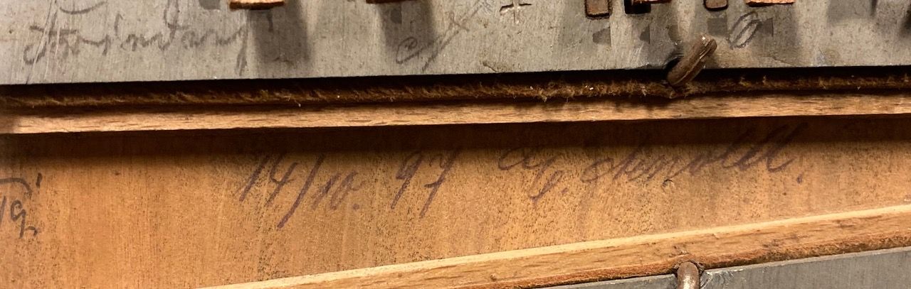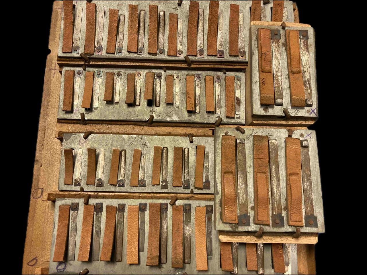 46 94 toner med zink toneplater og stålstemmer, to kor, oktavstemt, a=431. Ti store basstemmer i egne kamre. Knapper av bein med øyne av perlemor (skjorteknapper). På innsiden har Ernst Arnold signert på begge sider, med navn og datoene 14 og 15 november 1897.