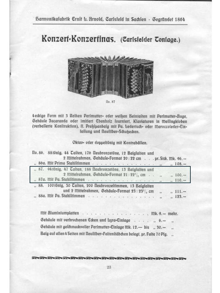 Ernst Louis Arnold (1838-1910) var verksmester I Carl Friedrich Zimmermann’s (1817-1898) harmonikafabrikk i Carlsfeld og overtok fabrikken da Zimmermann emigrerte til USA I 1864. Da han døde fortsatte og utvidet hans tre sønner virksomheten I to separate firmaer: ELA (Ernst Louis’s eldste sønn Ernst Herman (1859-1946) og AA (de to yngre sønnene Paul (1866-1952) og Alfred (1878-1933)). Arnold-fabrikkene I Carlsfeld ble de viktigste produsentene og eksportørene av tango-bandoneoner.